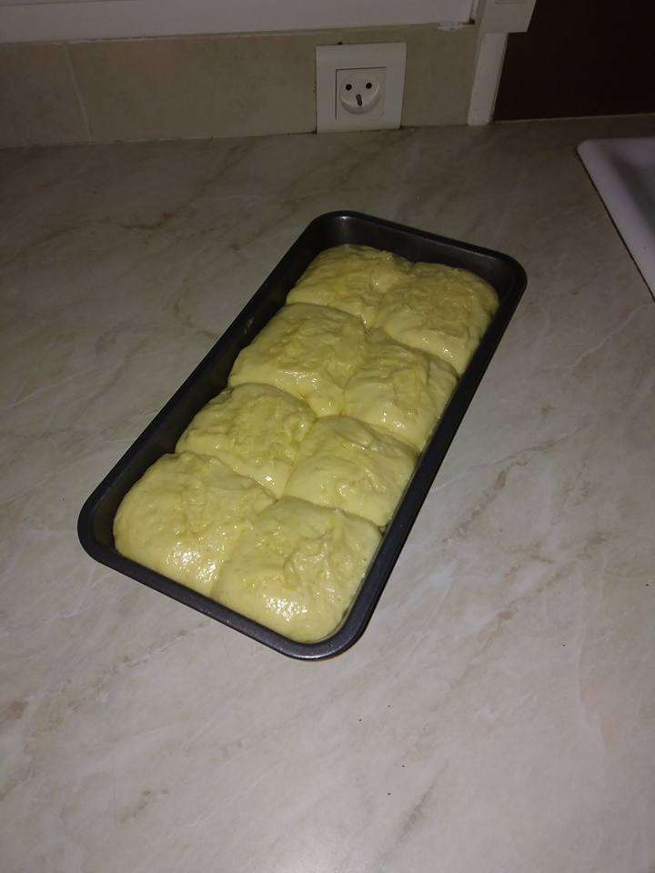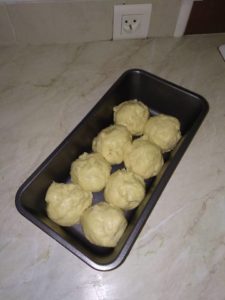 - Disposer les boules dans le moule à cake beurré de façon à faire 2 rangées de 4 boules.