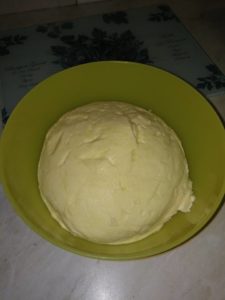 - Incorporer ensuite le beurre ramolli coupé en petits dés et pétrir à nouveau 10min jusqu’à ce que la pâte ne colle plus. Au fur et à mesure, elle devient de plus en plus élastique et se regroupe pour ne plus coller au saladier.